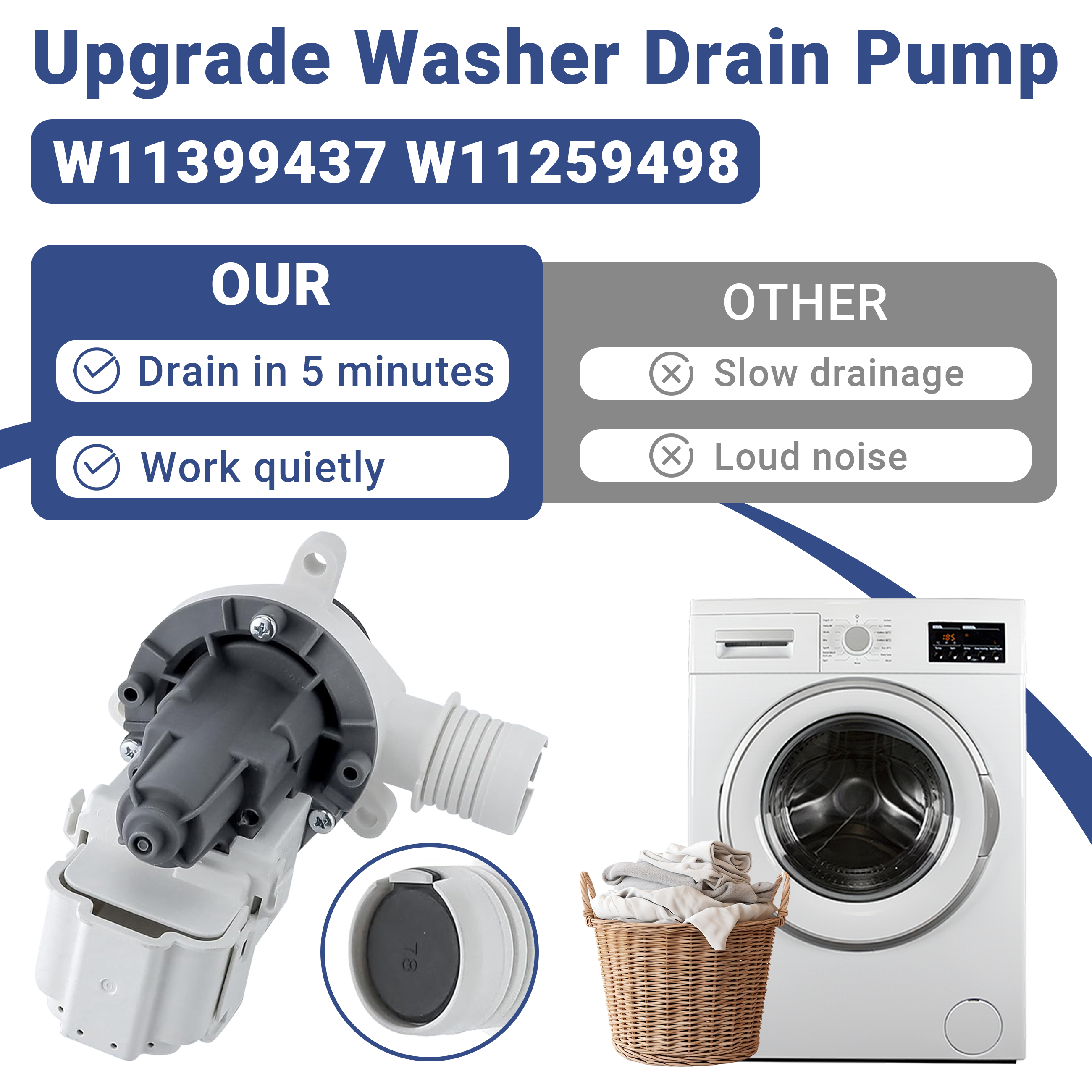 W11399437 W11259498 B25-3A04 Drain Pump Assembly Replacement efficiently resolves multiple washing machine malfunctions, including failure to drain, pump running but drum not spinning, water leakage, abnormal operational noise, and pump running without pumping water. It quickly restores the appliance to normal operation.