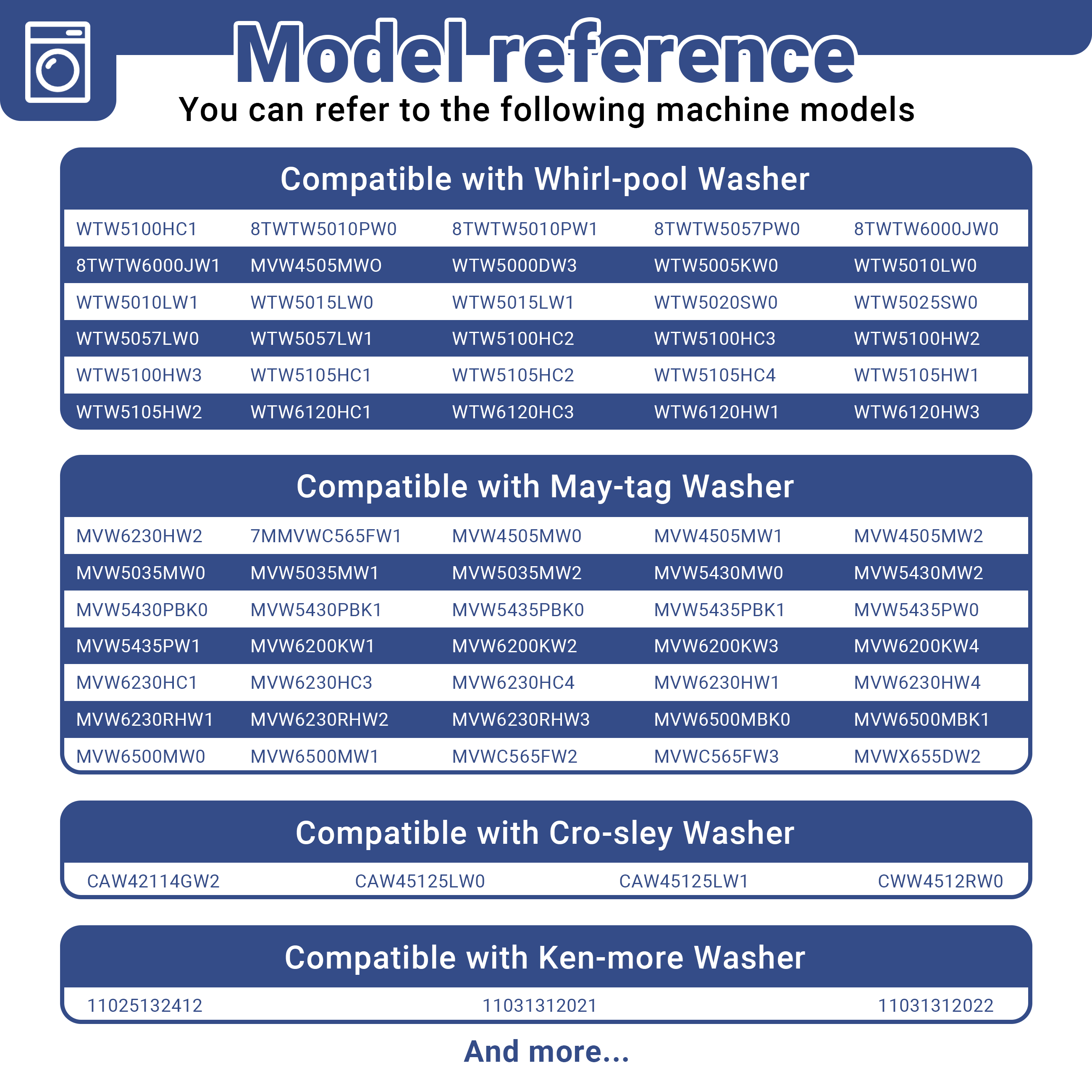 Whirlpool | WTW5000DW3 WTW5005KW0 WTW5010LW0 WTW5010LW1 WTW5015LW0 WTW5015LW1 WTW5057LW0 WTW5057LW1 WTW6120HC1 WTW6120HC3 WTW6120HW1 WTW6120HW3 WTW5100HC1 8TWTW5010PW0 8TWTW5010PW1 8TWTW5057PW0 8TWTW6000JW0 8TWTW6000JW1 MVW4505MW0 WTW5100HC2 WTW5100HC3 WTW5100HW2 WTW5100HW3 WTW5105HC1 WTW5105HC2 WTW5105HW1 WTW5105HW2 |