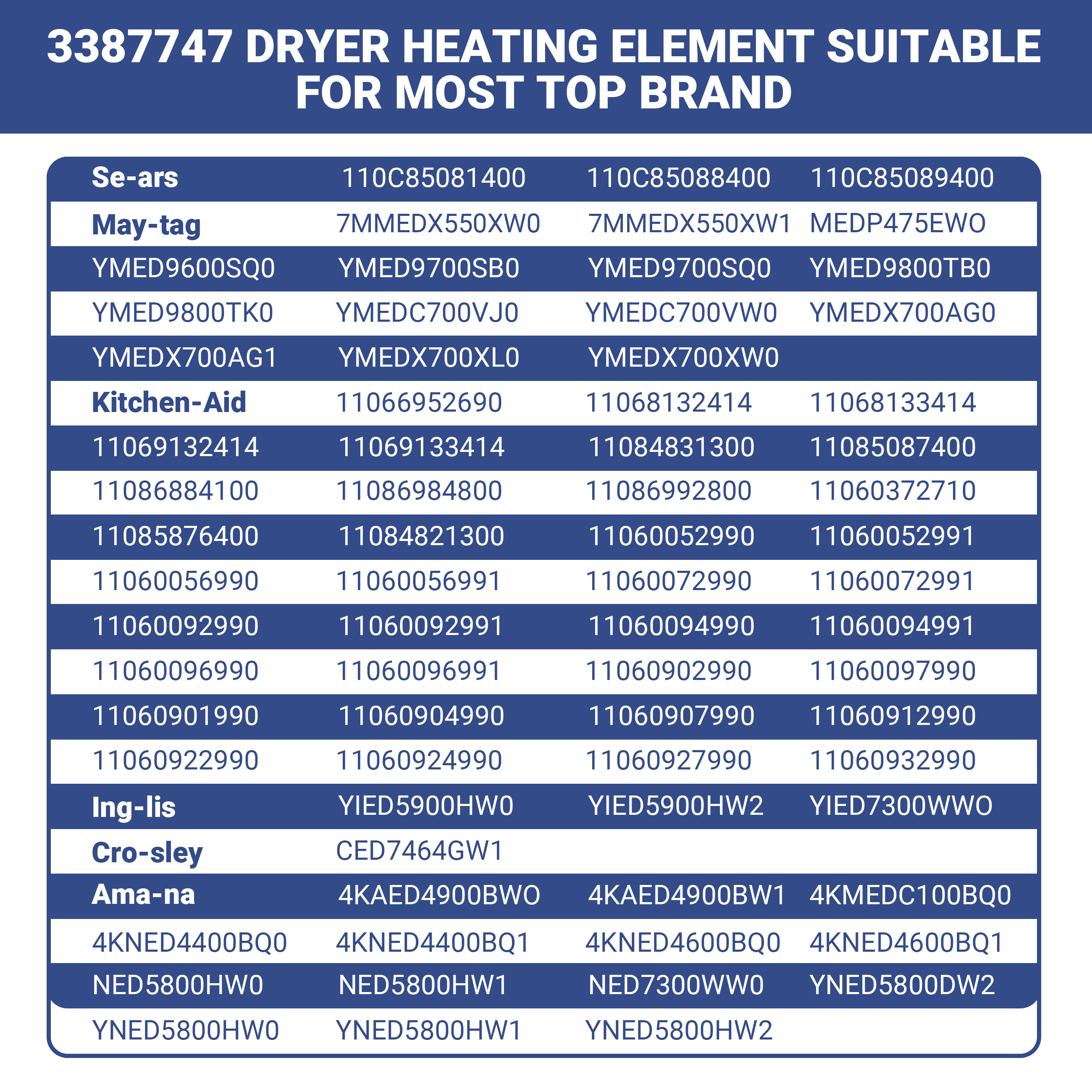 Compatible brands Whirlpool, Maytag and Kitchen Aid.The brands mentioned above are just for compatibility reference.