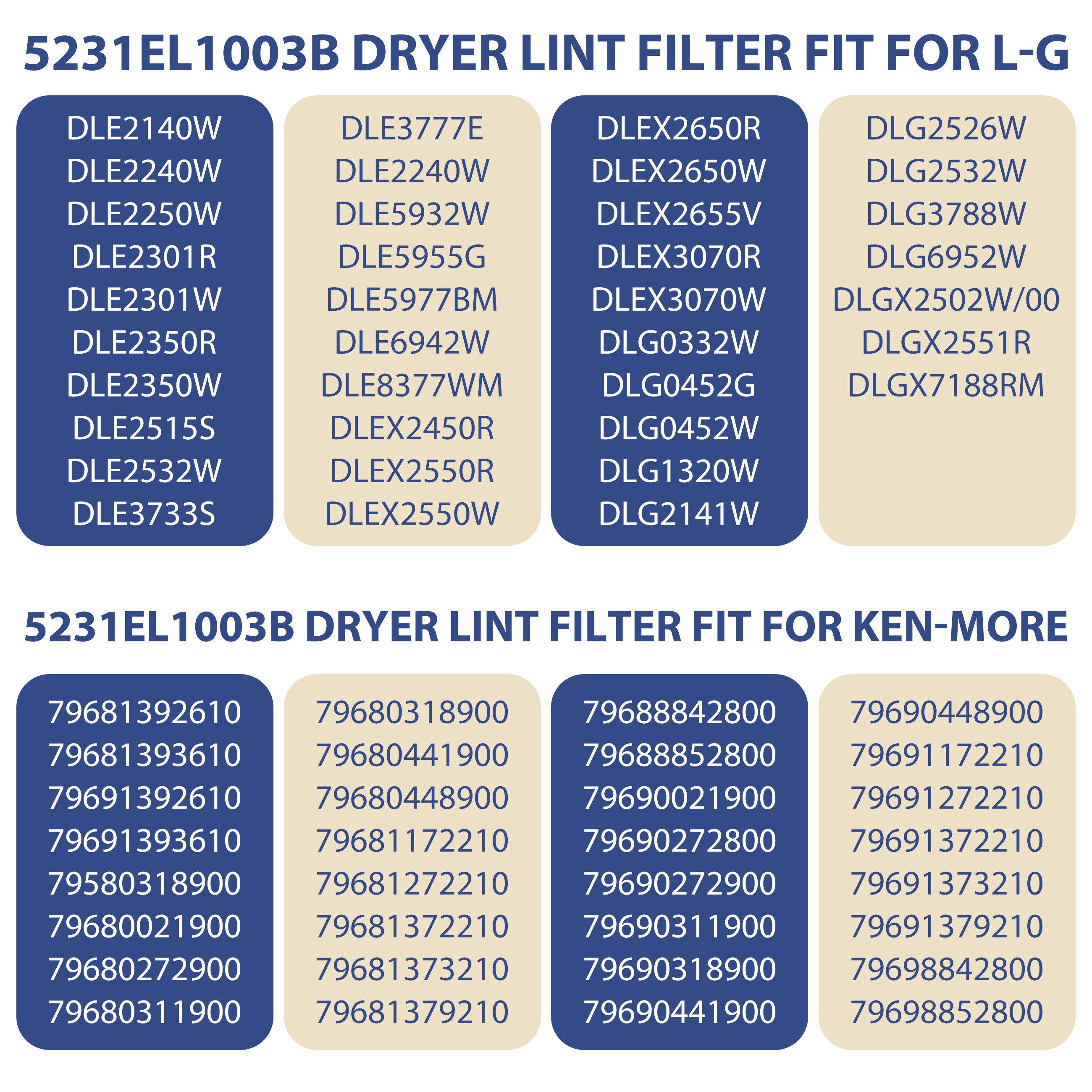 Dryer lint filter mesh screen replace 5231EL1003B 1266857, 5231EL1002E, 5231EL1003A, 5231EL1003C, 5231EL1003E, AH3527578, AP4440606, EA3527578, PS3527578 etc.