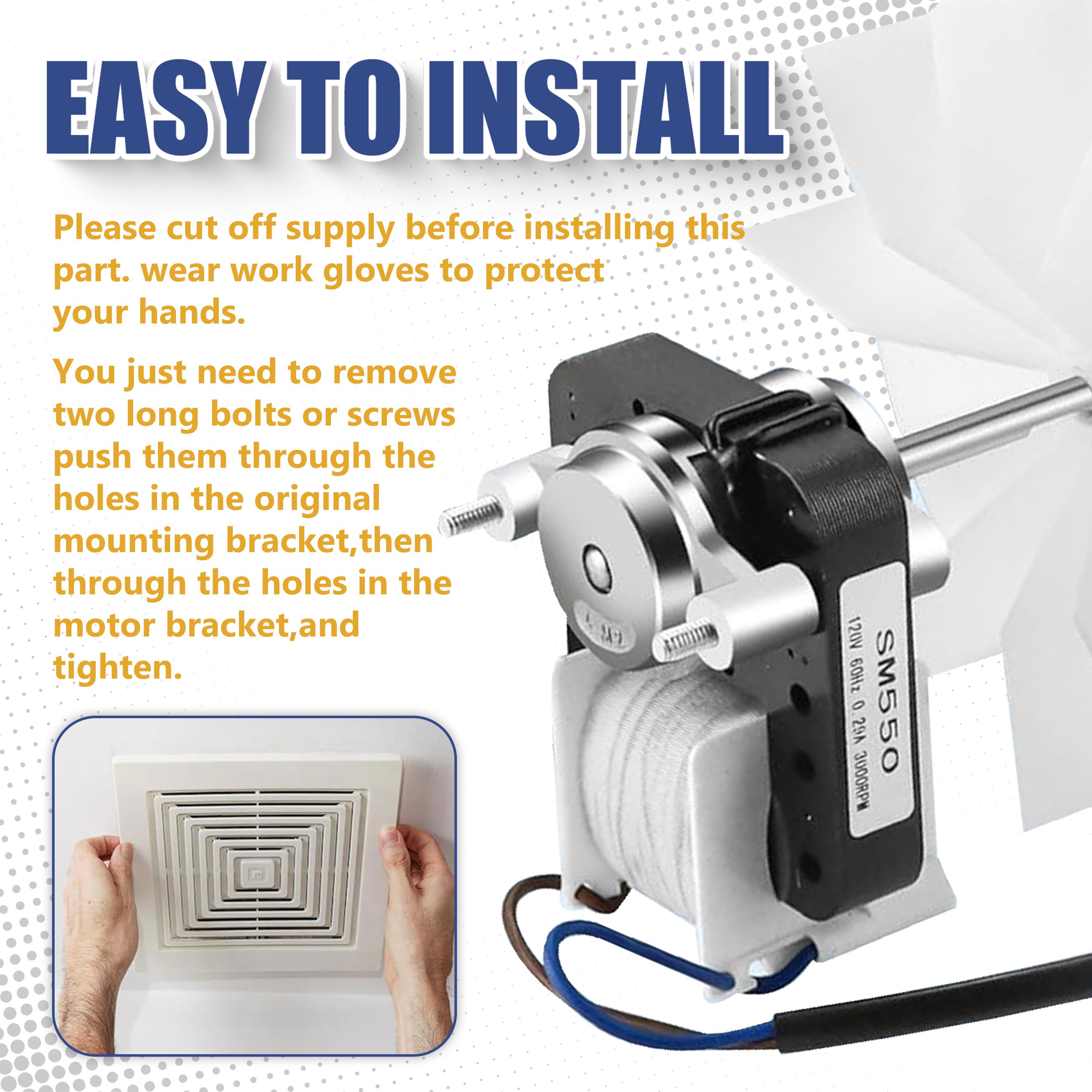 AMI PARTS SM550 Bathroom Fan Motor Installation is Extremely Simple 1. Before installation, be sure to disconnect the power supply and wear work gloves to protect your hands; 2. Remove the two original long screws; 3. Thread the screws sequentially through the original mounting bracket holes and the motor bracket holes, then tighten them securely. No complex tools are required throughout the entire process.