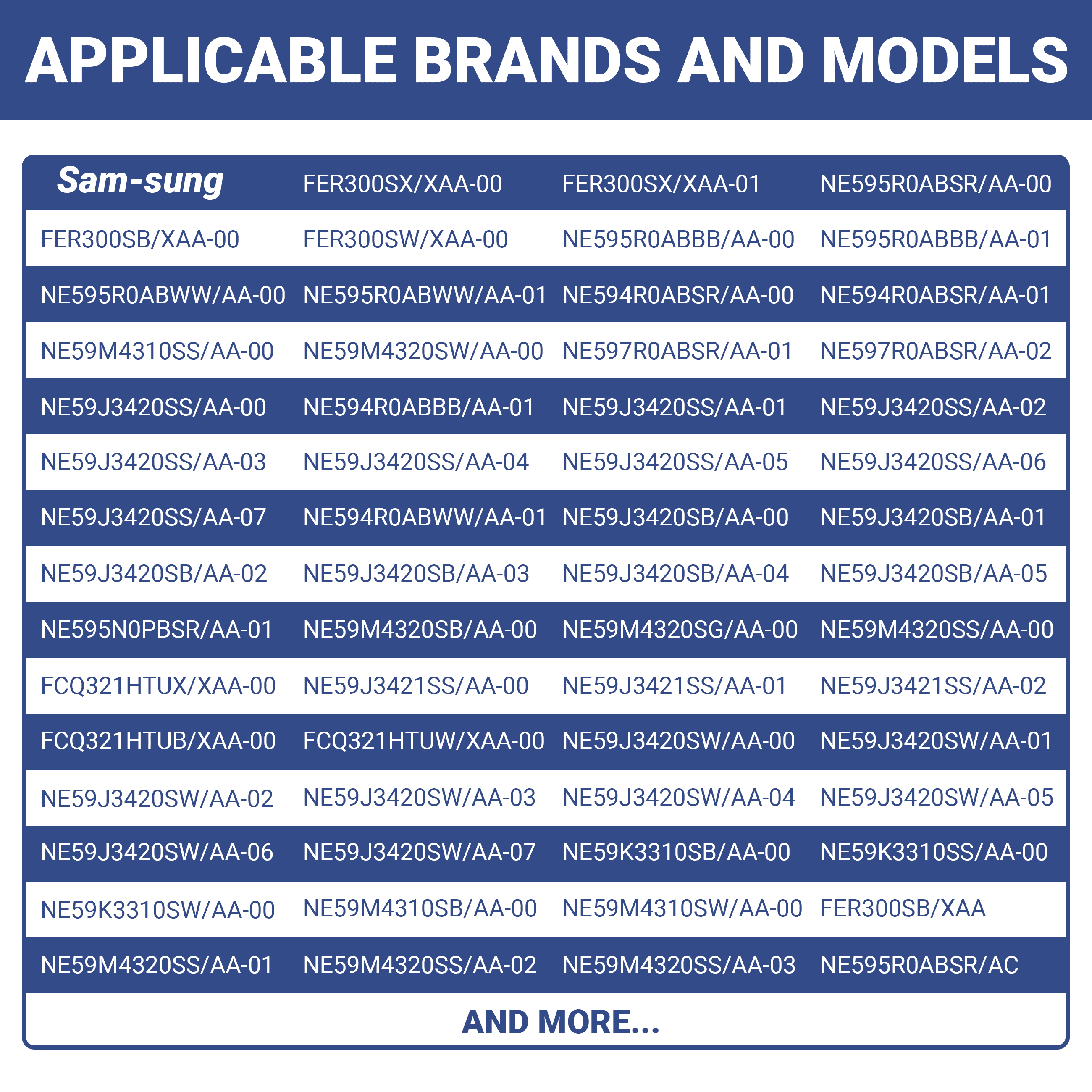 | Samsung | FER300SX/XAA-00, FER300SX/XAA-01, FER300SX/XAA-00, FER300SX/XAA-01, NE595R0ABSR/AA-00, FER300SB/XAA-00, FER300SW/XAA-00, NE595R0ABBB/AA-00, NE595R0ABBB/AA-01, NE595R0ABWW/AA-00, NE595R0ABWW/AA-01, NE594R0ABSR/AA-00, NE594R0ABSR/AA-01,NE59M4310SS/AA-00, NE59M4320SW/AA-00, NE597R0ABSR/AA-01, NE597R0ABSR/AA-02, NE59J3420SS/AA-00, NE594R0ABBB/AA-01, NE59J3420SS/AA-01, NE59J3420SS/AA-02, NE59J3420SS/AA-03, ect. |