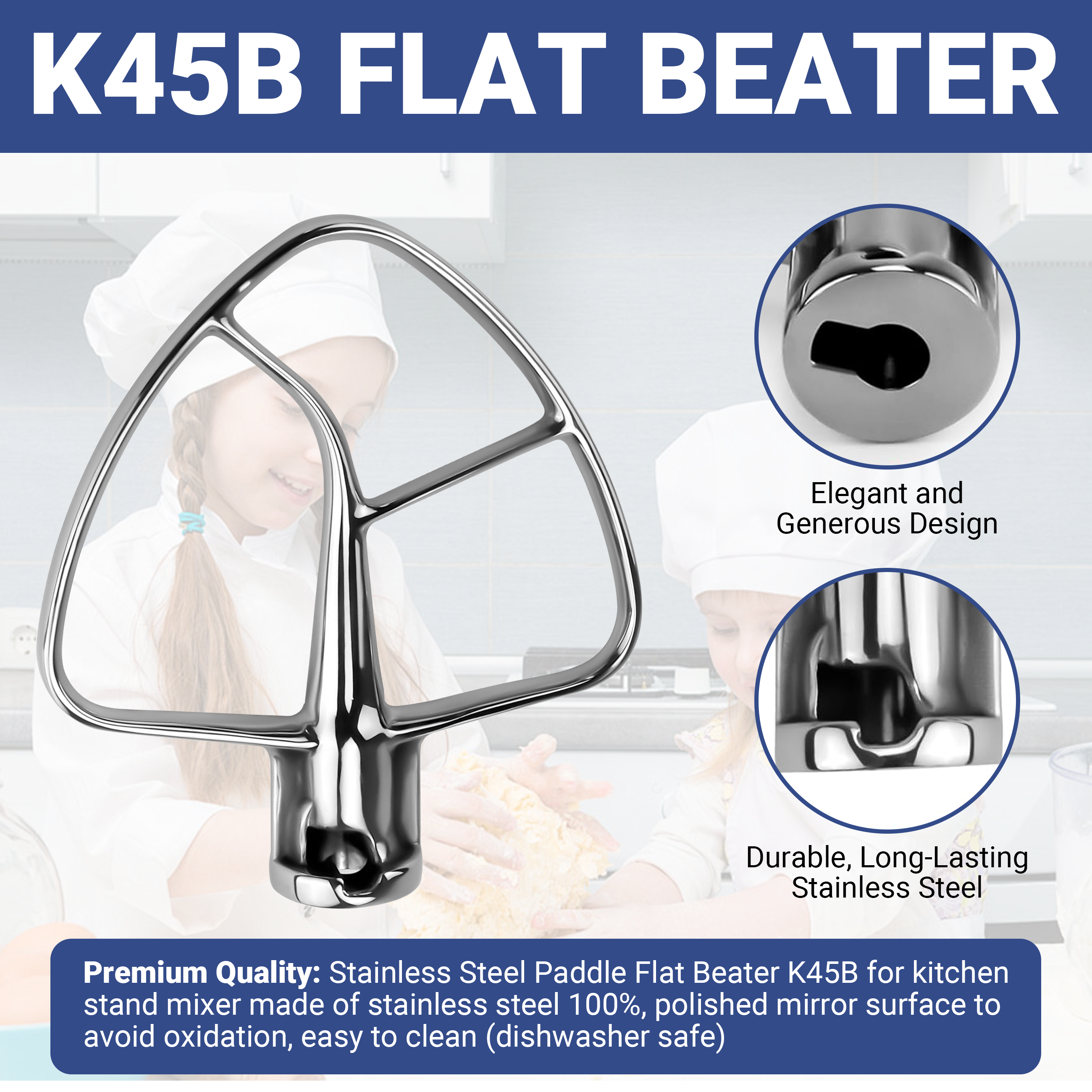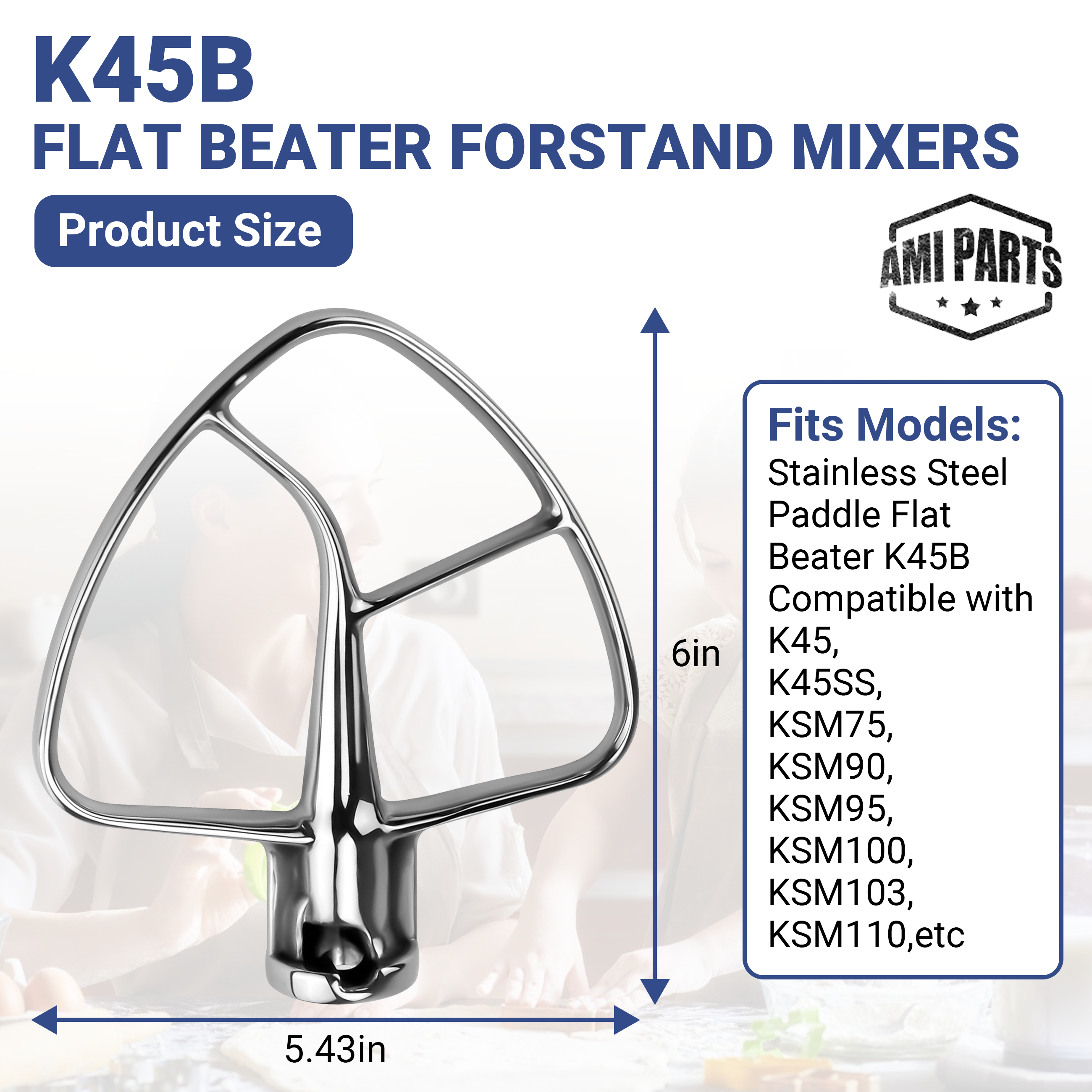 Stainless Steel Paddle Flat Beater K45B fit for K45, K45SS, KSM45, KSM75, KSM88, KSM90, KSM96, KSM90, KSM95, KSM100, KSM103, KSM110,etc. Replaces 1181238, 4162163, 4169986, 9707669, 9708470, 9708472, WPW10672617, W10672617, AP6023717, PS11757063, W10687981, AP3884849.