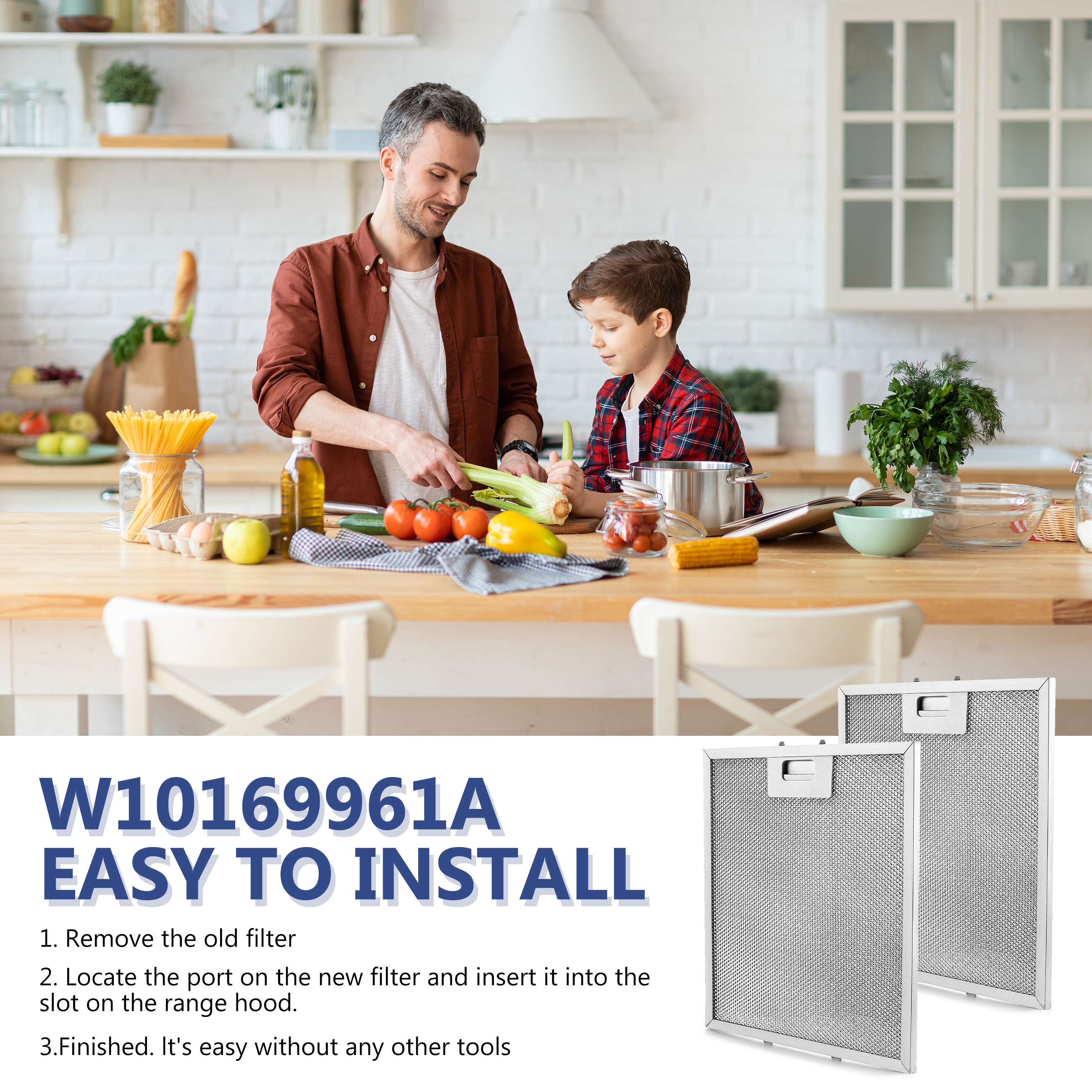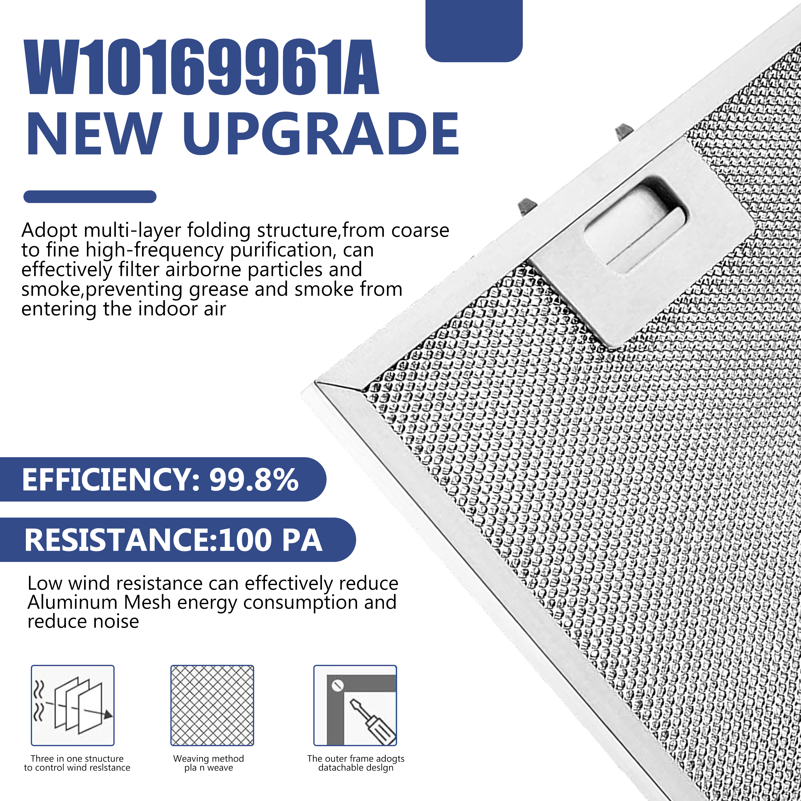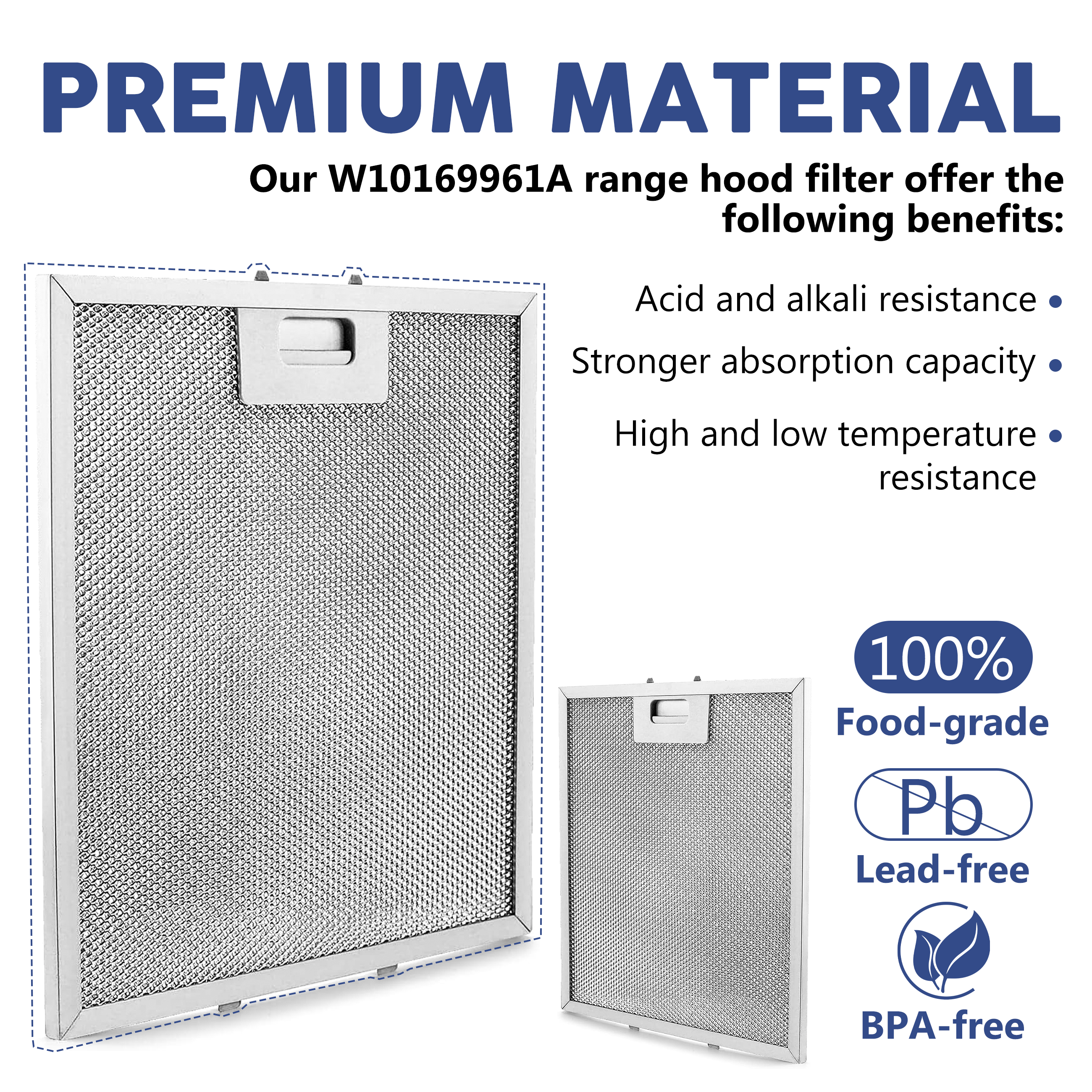 Benefits: W10169961A Range Hood Filter Upgraded for Perfect Compatibility with Your Appliance! Newly added movable handle latch ensures a tight seal without loosening, enabling quick and efficient installation/removal. Upgraded triple-function integrated filter significantly enhances filtration performance, thoroughly intercepting grease and fumes. Integrated aluminum latch design at the end effectively prevents damage during use. Thickened aluminum frame structure provides stability and strong resistance to deformation, extending service life.