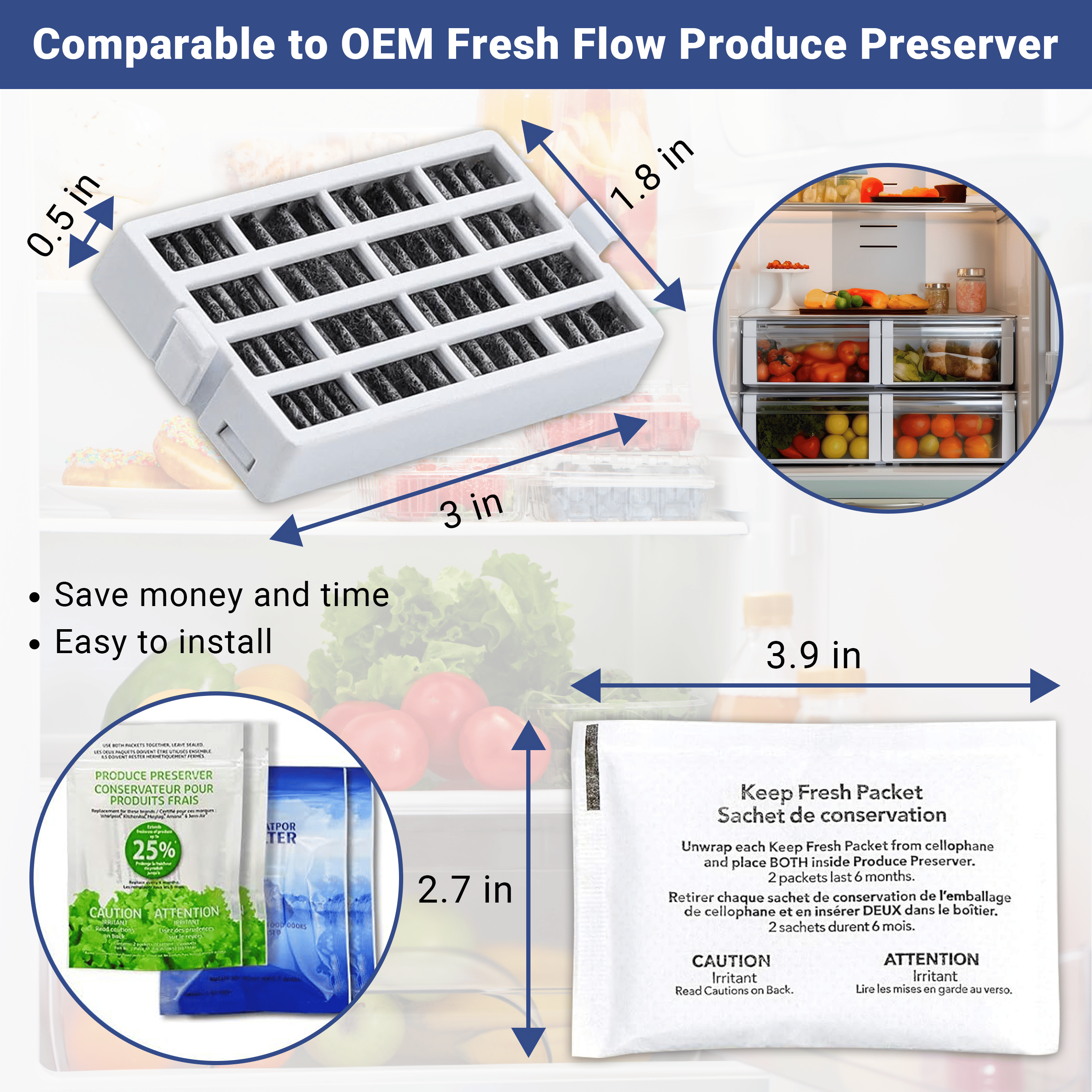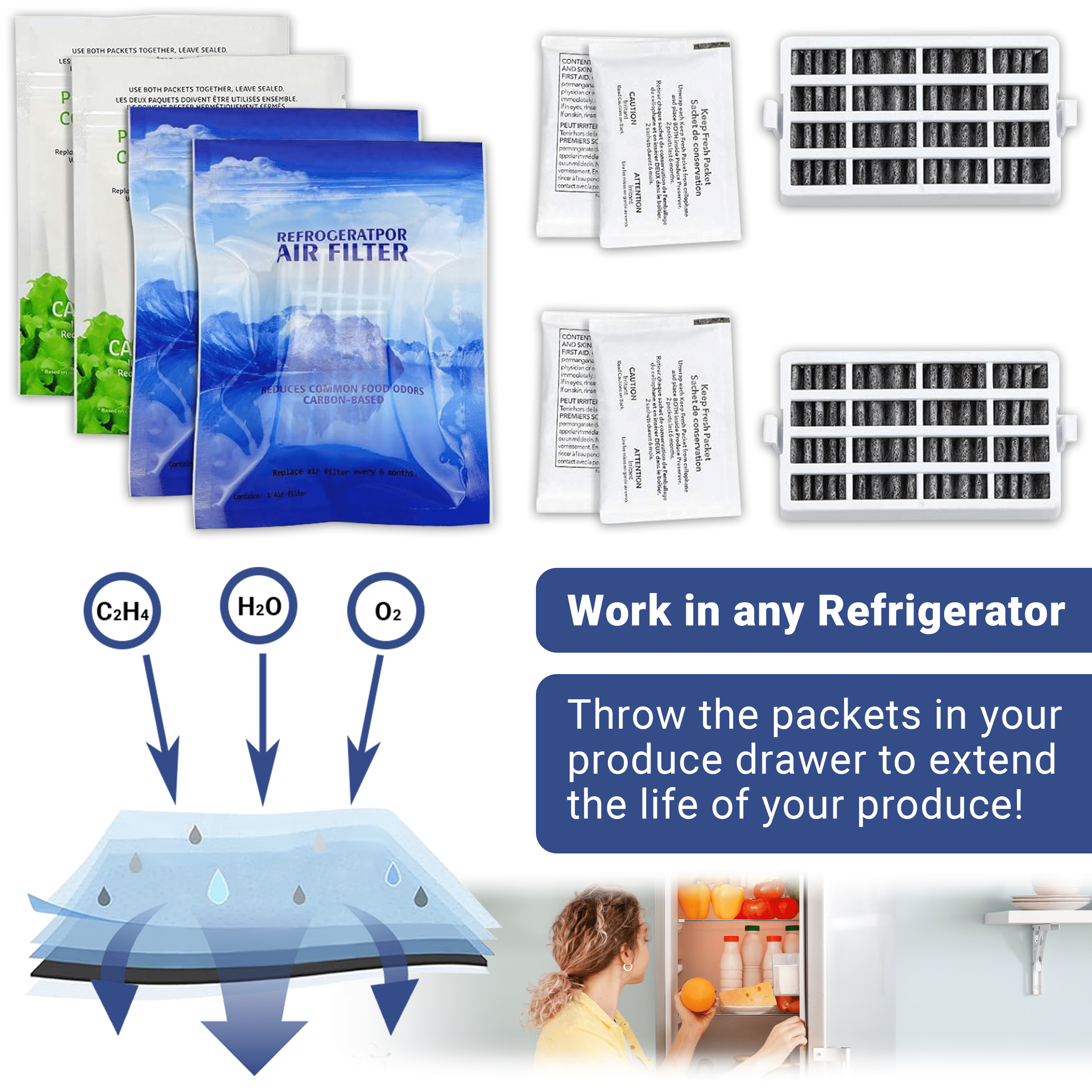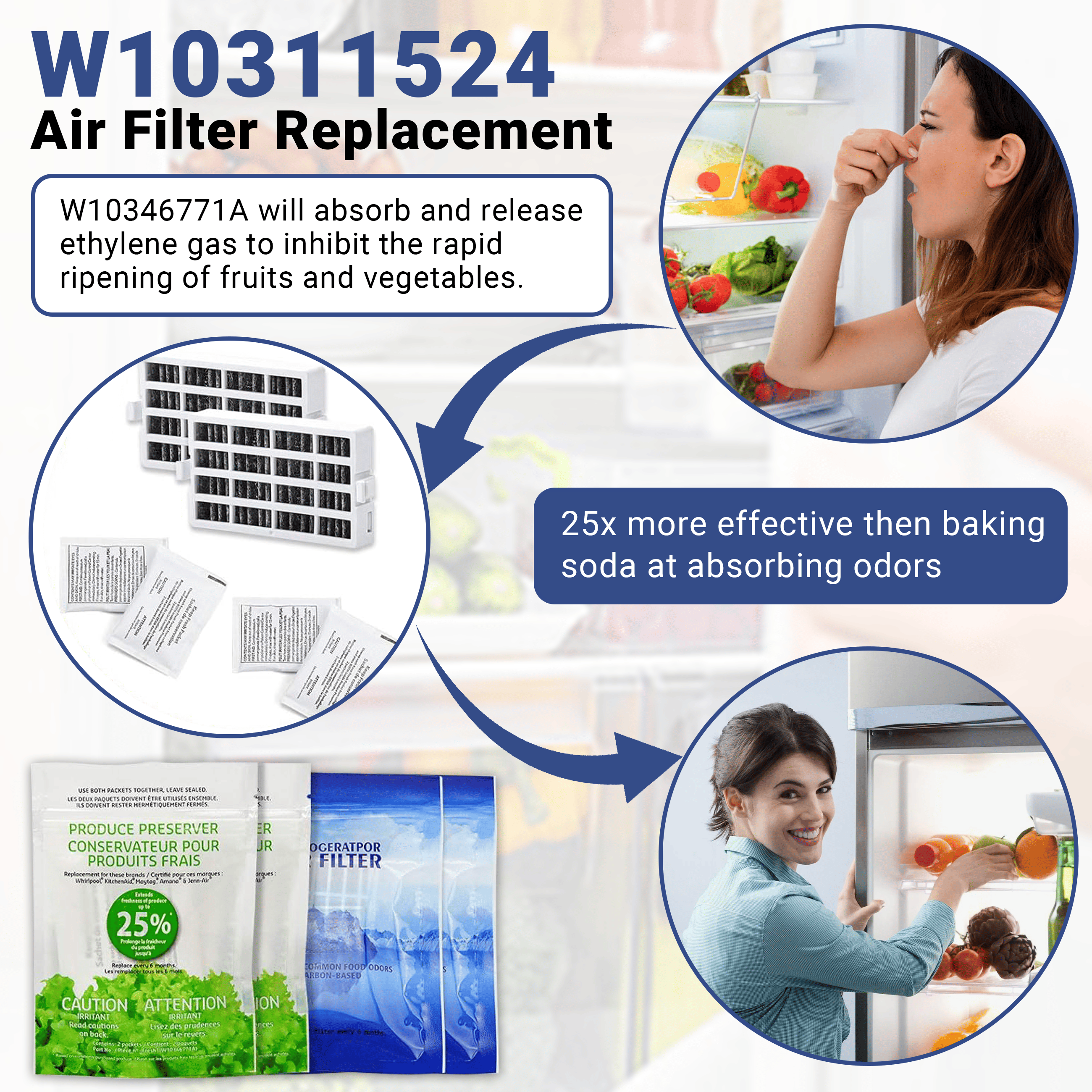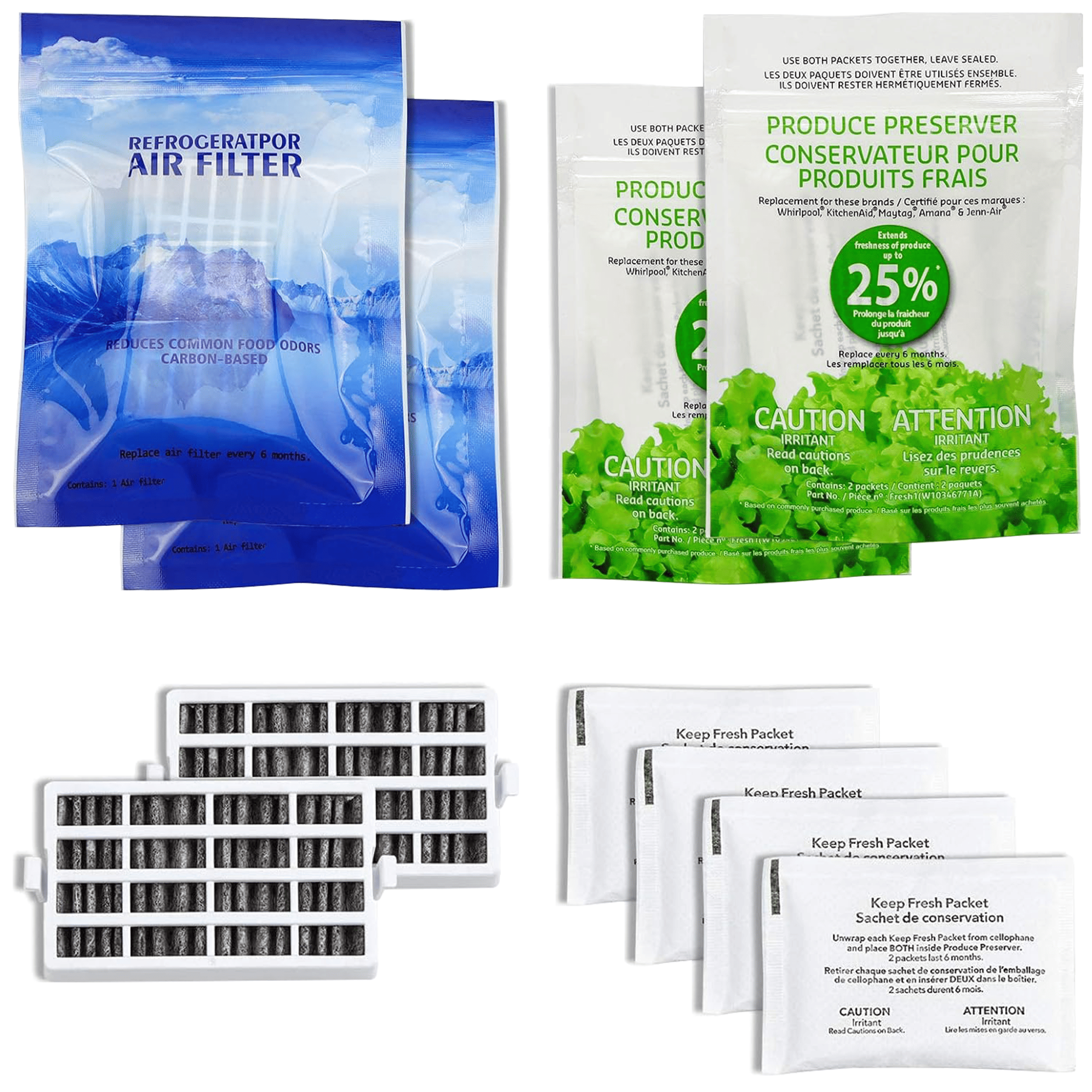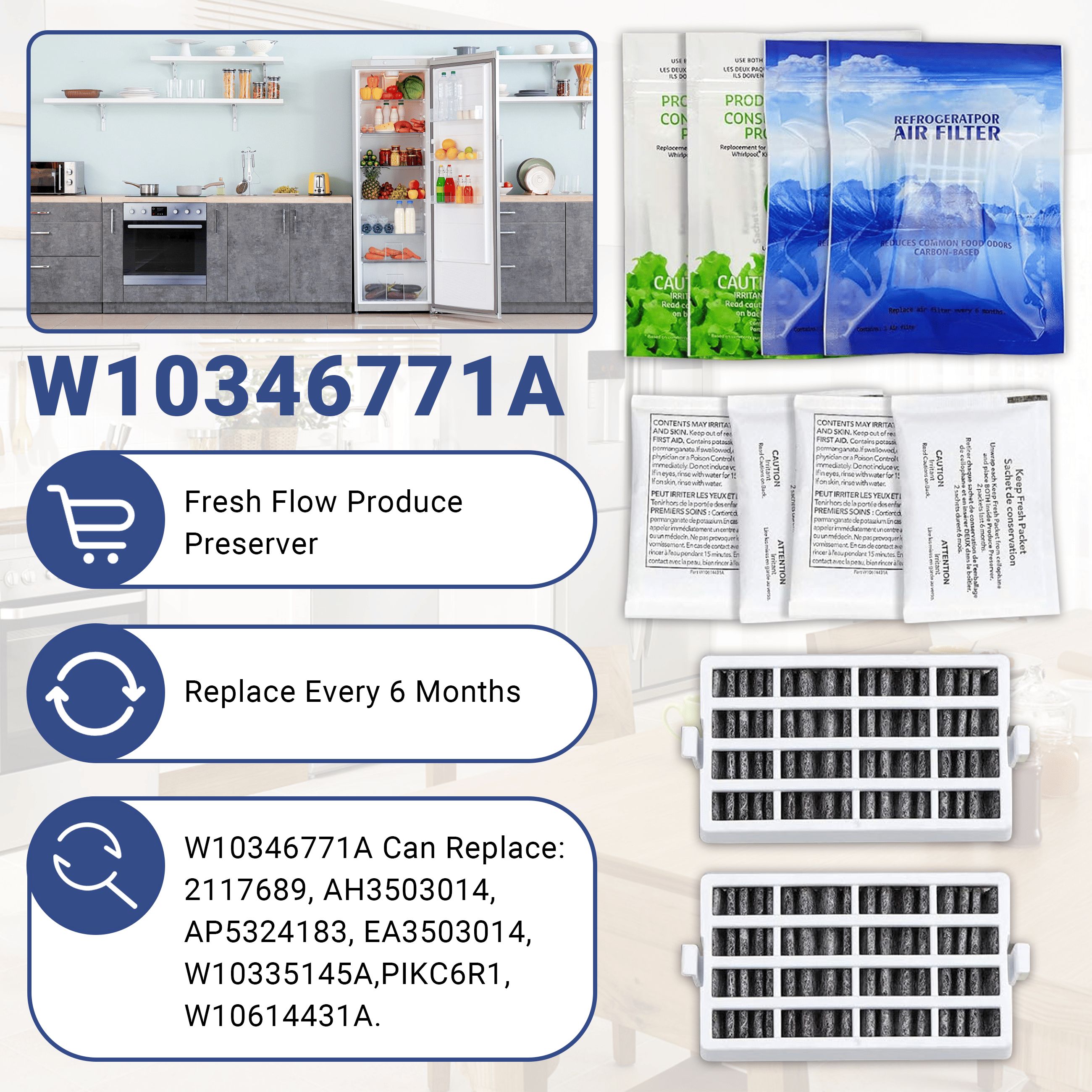 Contains: 2-Pack W10311524 AIR1 Fresh Flow Air Filter; 2-Pack W10346771A Produce Preserver(4 packets)