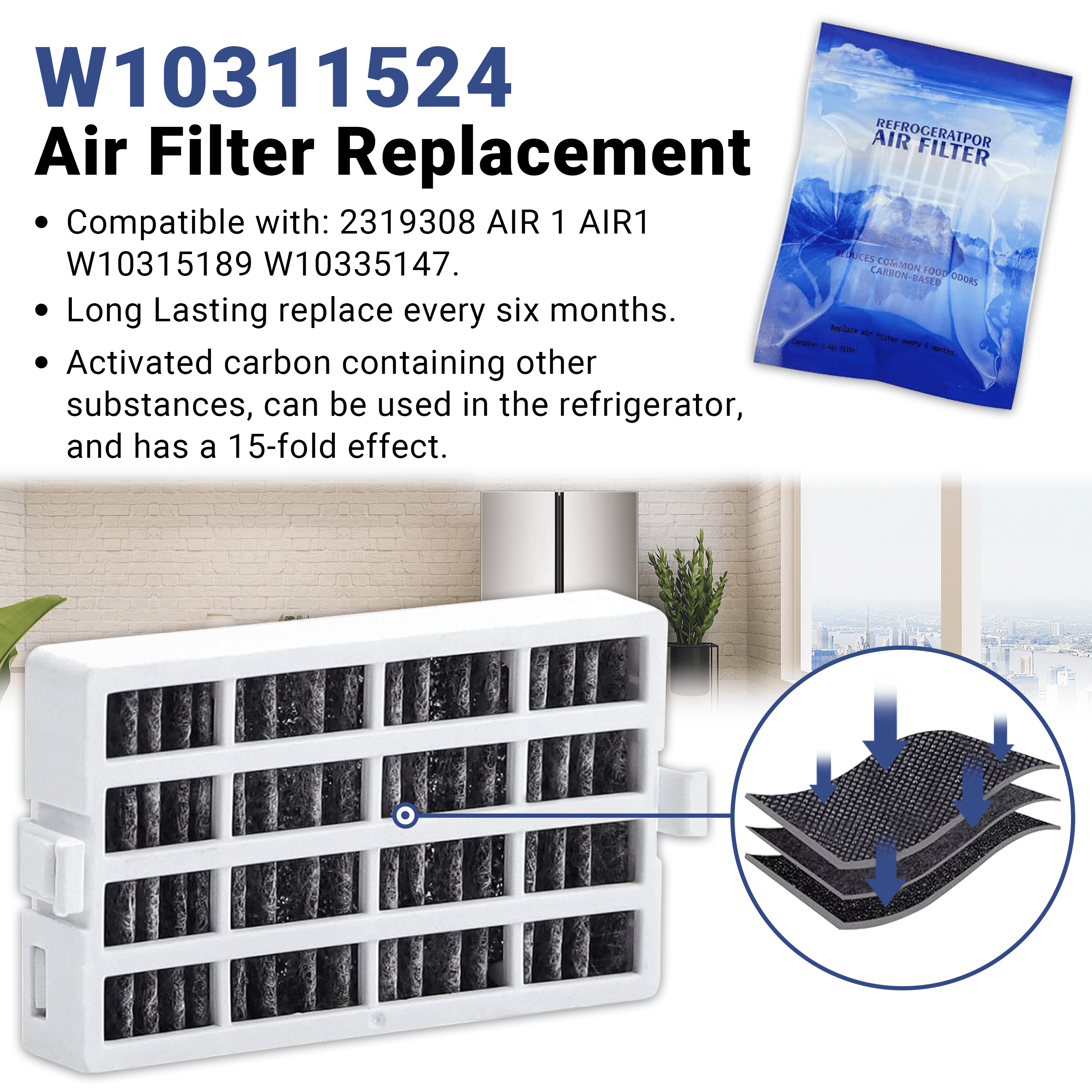 W10311524 freshflow refrigerator air filter replacement helps absorb odor, smoke, volatile organic compounds and remove impurity, 15 times more effective than baking soda to keep your refrigerator air fresh and odor-free.
