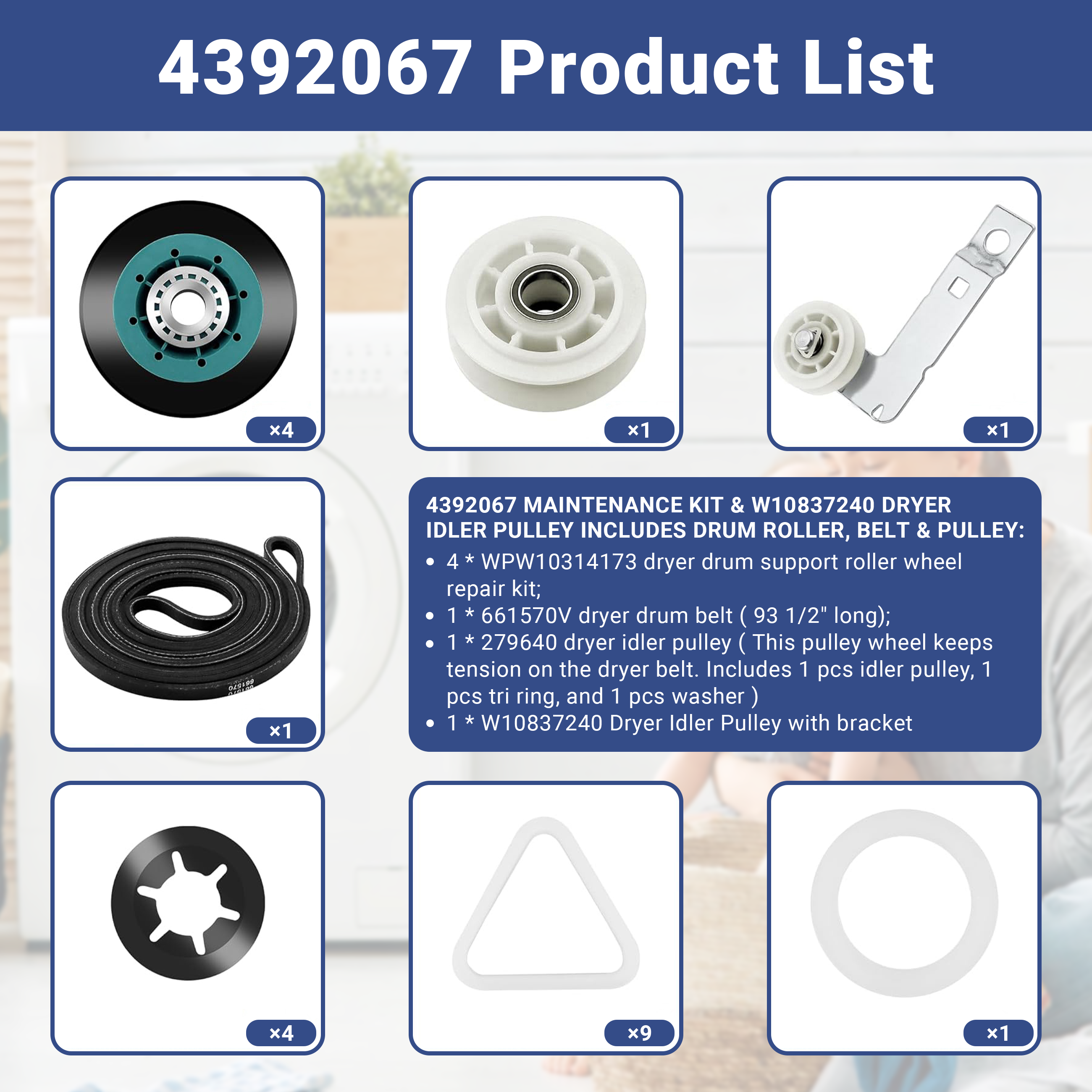 4392067 drum roller, belt & pulley maintenance kit replacement part number :2015, 4392067VP, 80047, 587637, AP3109602, PS373088, EAP373088 W10837240 Dryer Idler Pulley replacement part number:3387372,3388674,W10118754,W10118756,W10547287,W10547290,W10837240VP