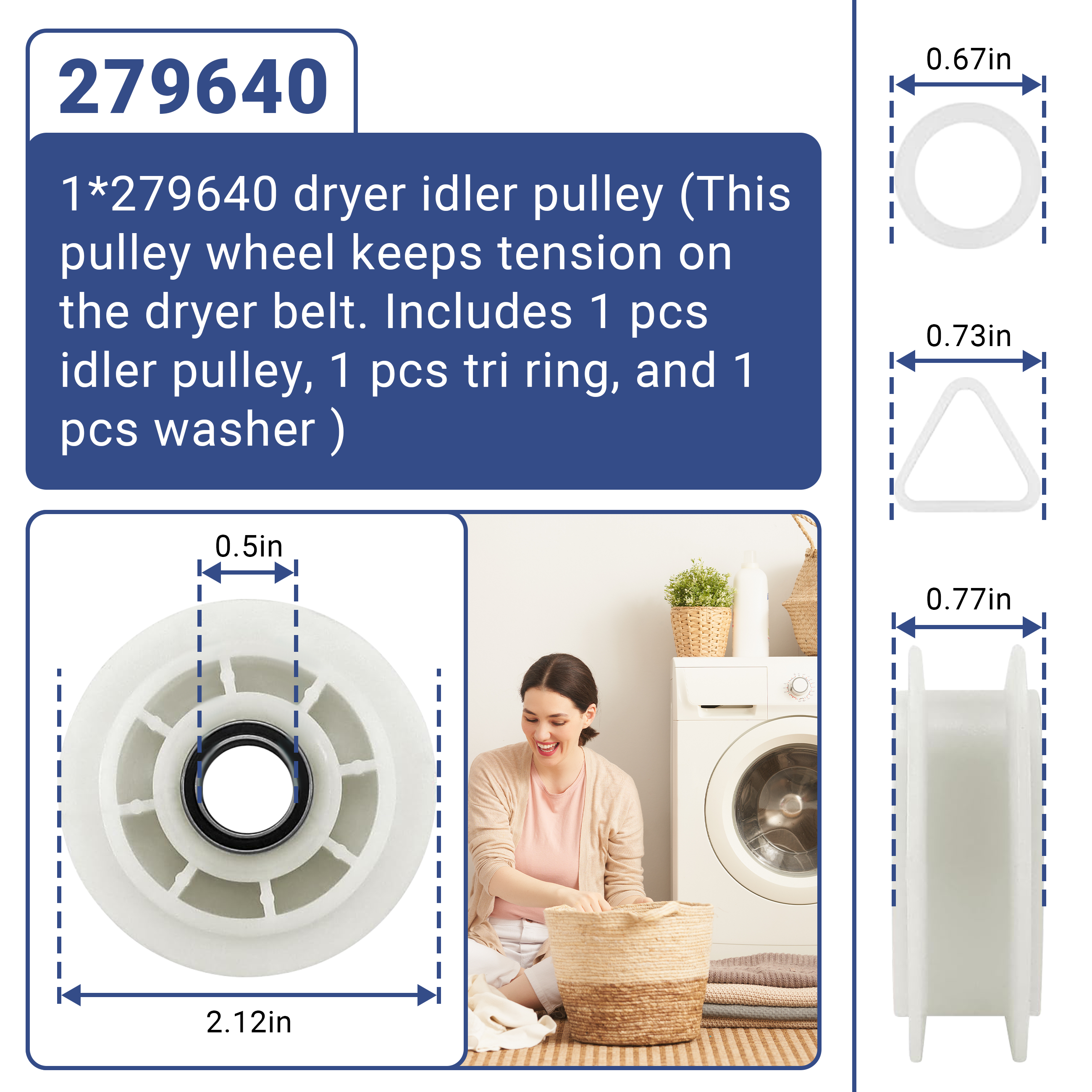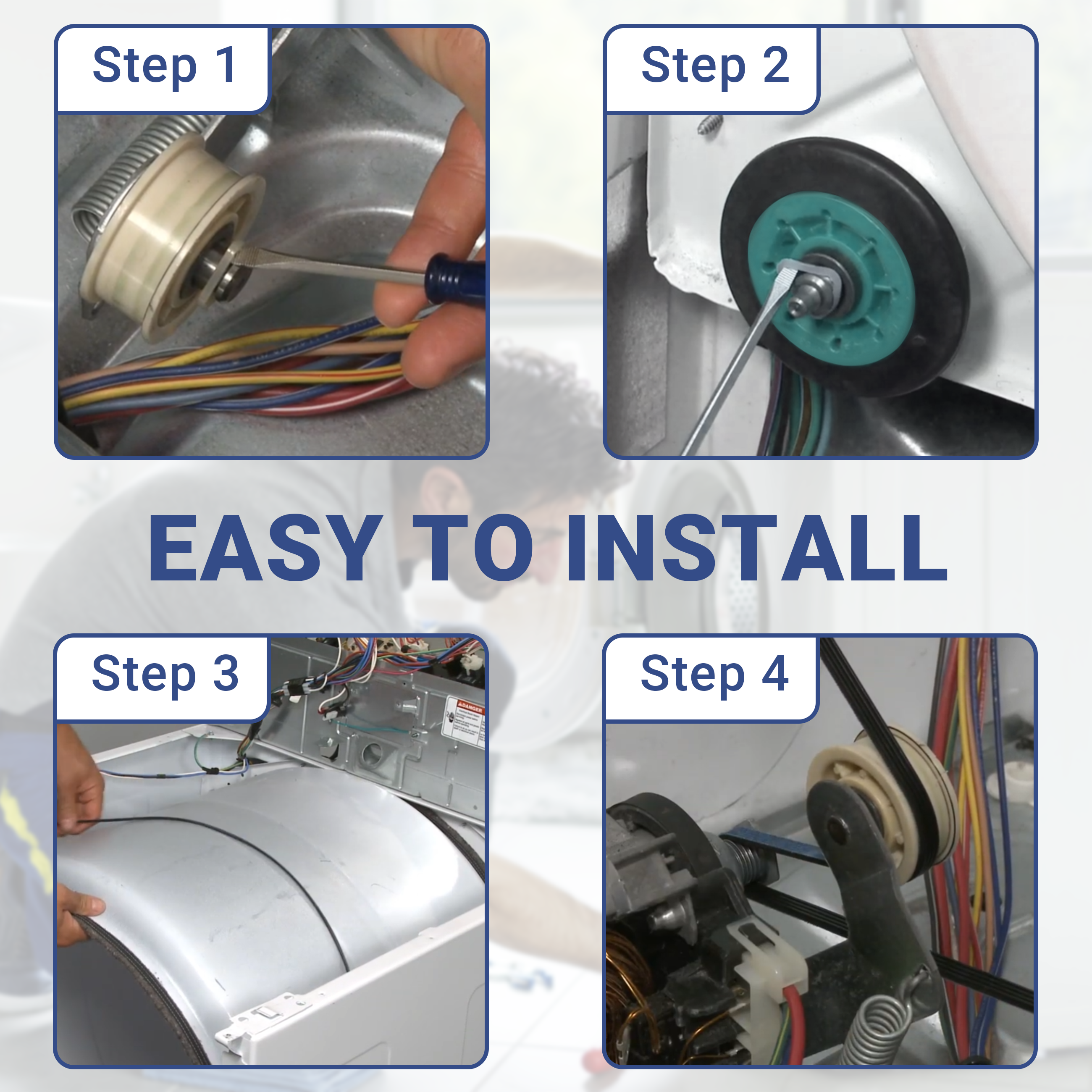 If your dryer is making unusual noise, failing to tumble, leaving marks on clothes, or not starting, simply remove the back and top panels of the dryer, then take out and replace the two bottom rollers to complete the repair. The idler pulley helps keep the drum in position as it rotates on the support rollers. This replacement is quick and easy to install, helping you save both time and money on maintenance.