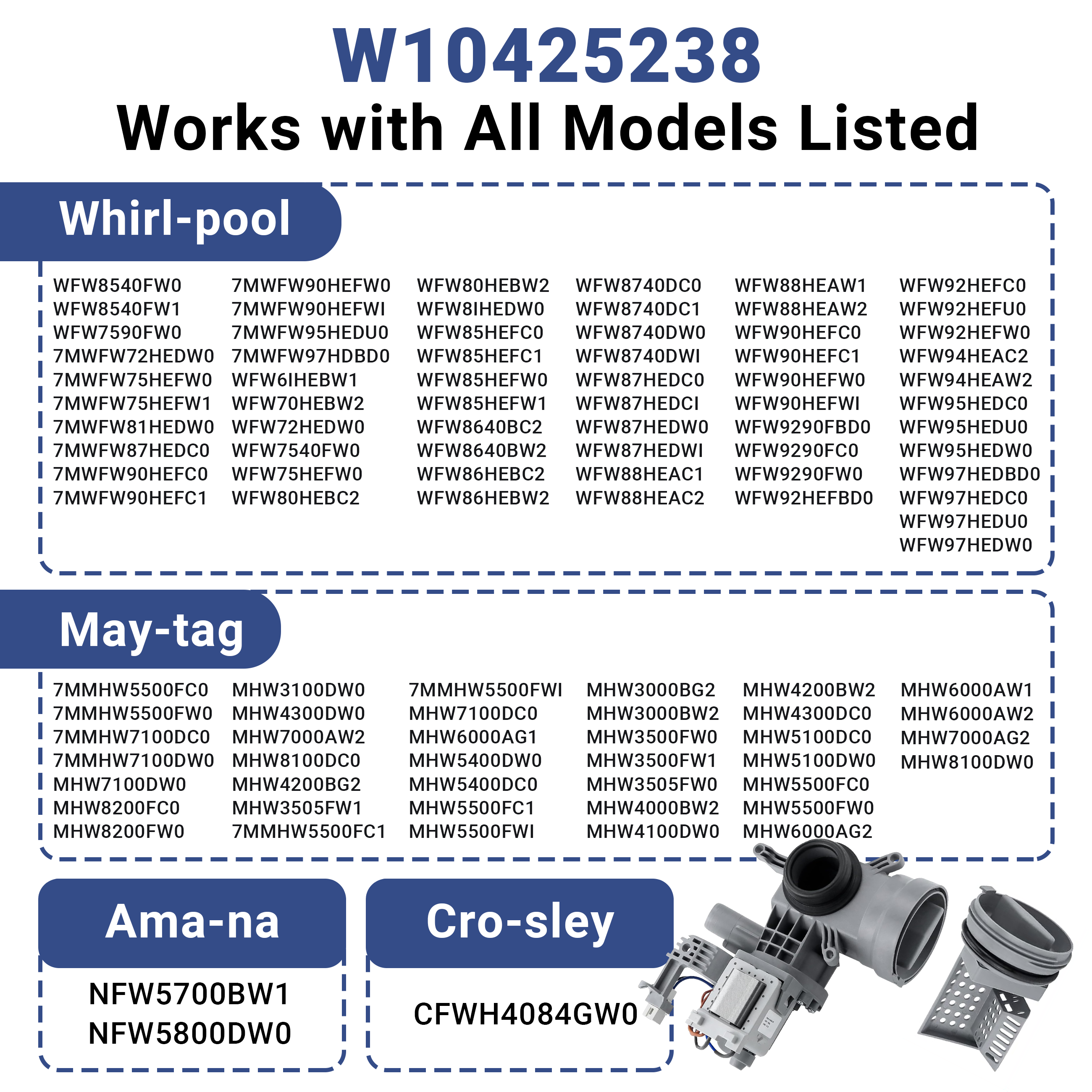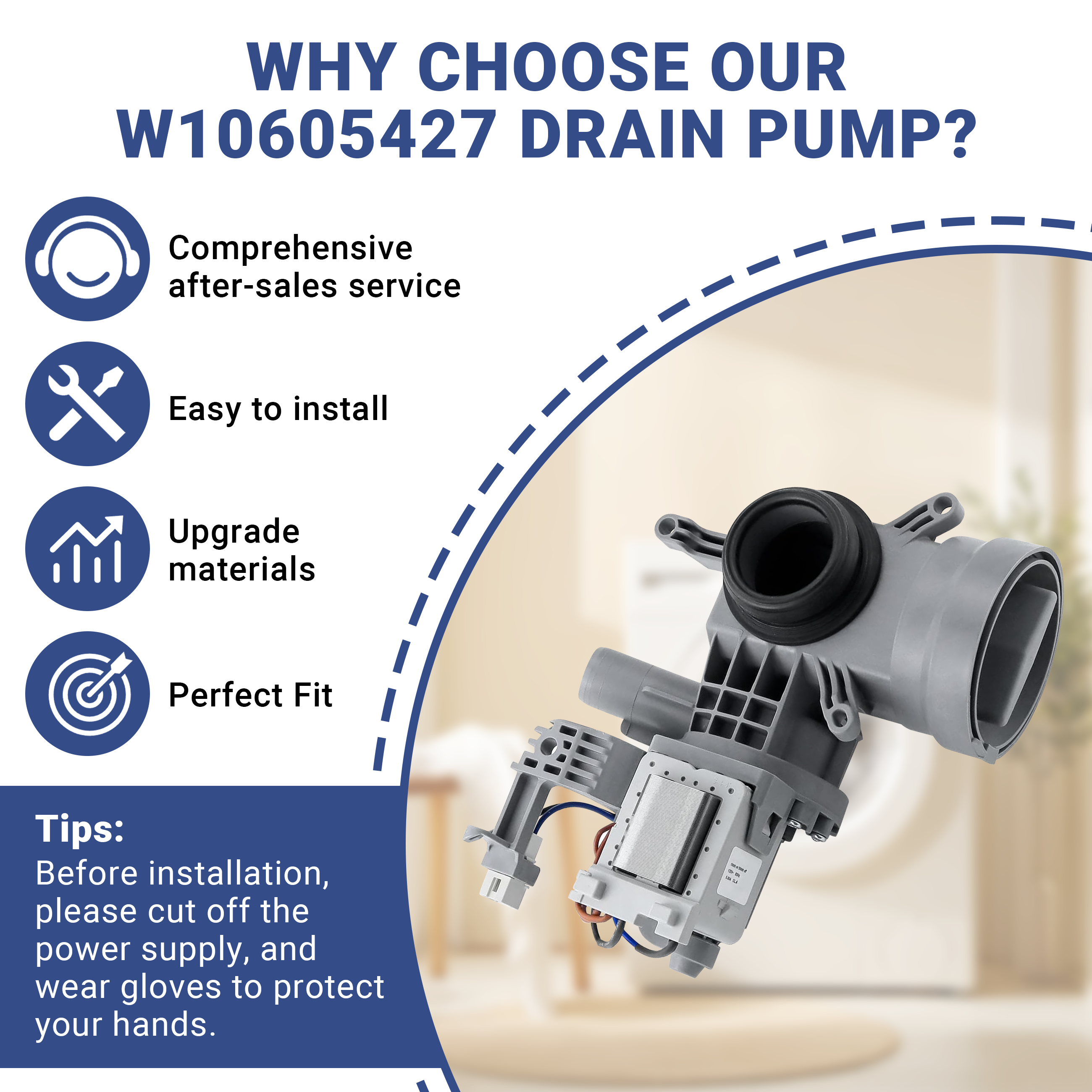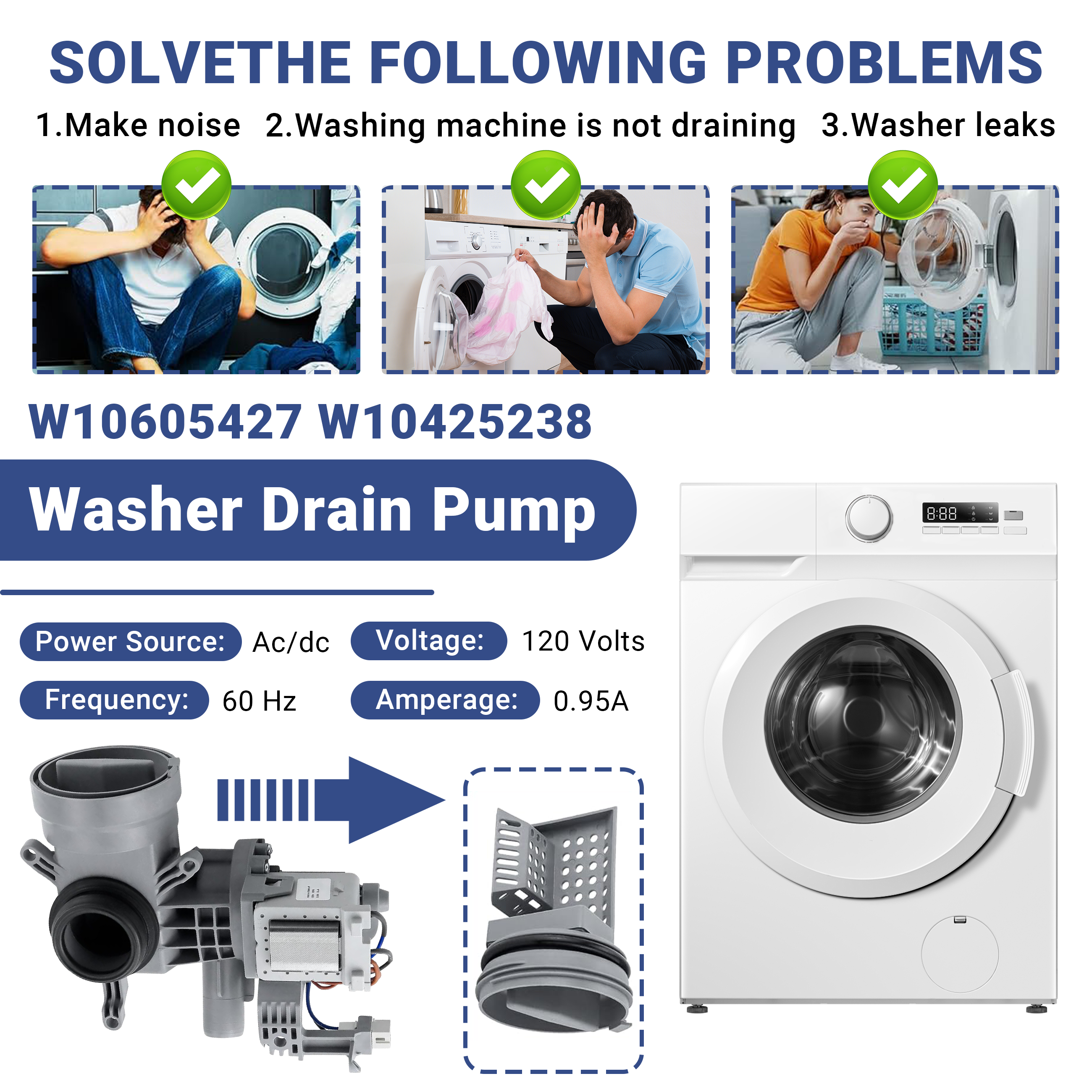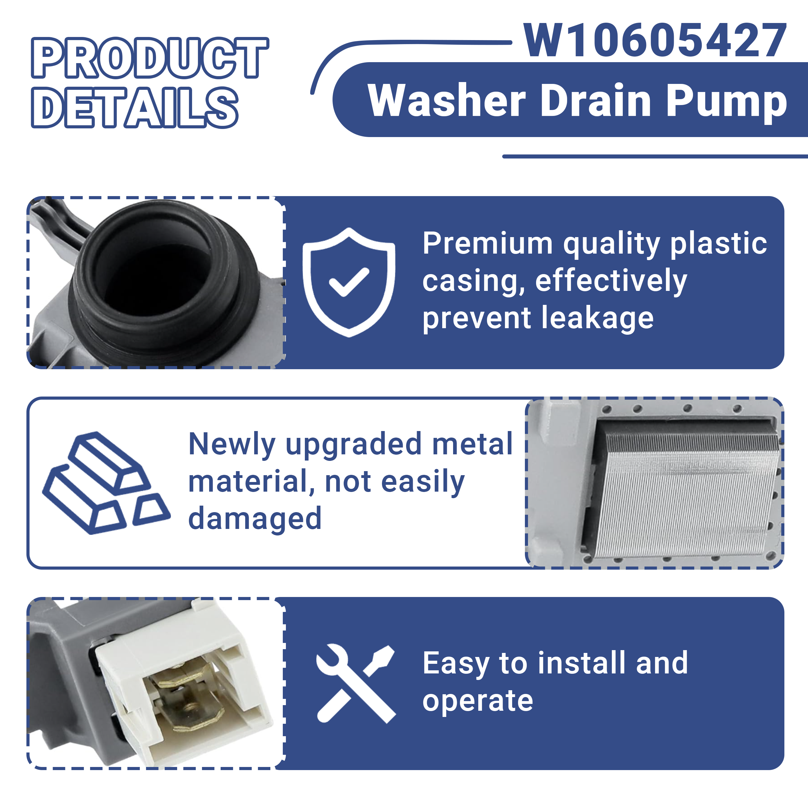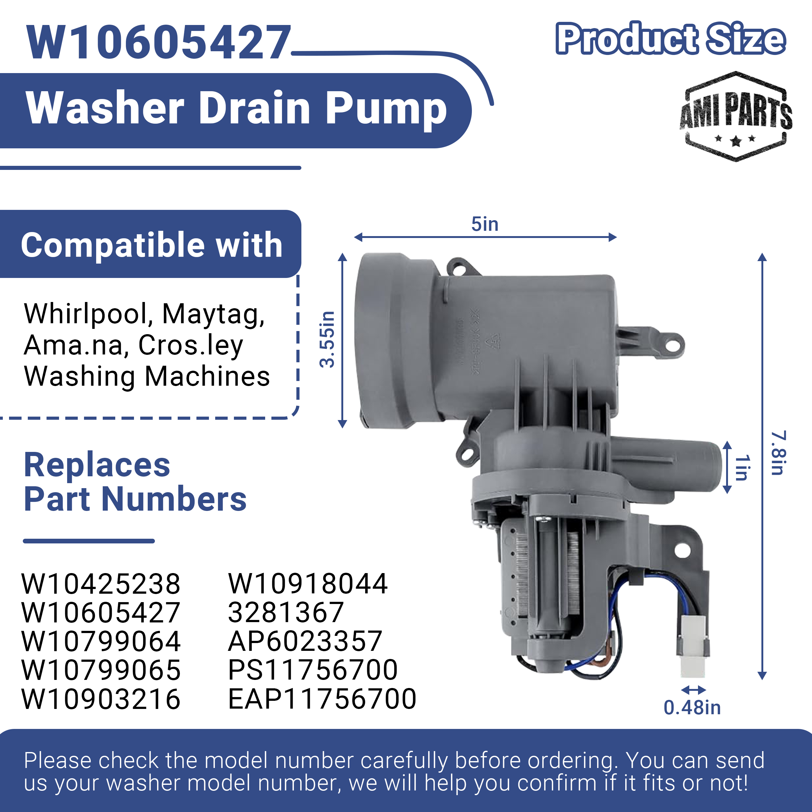 Directly replaces WPW10425238, W10918044, W10605427, WPW10605427VP, W10799065, PS11756700, W10799064, W10903216, EAP11756700, AP6023357, 3281367 washer drain pump